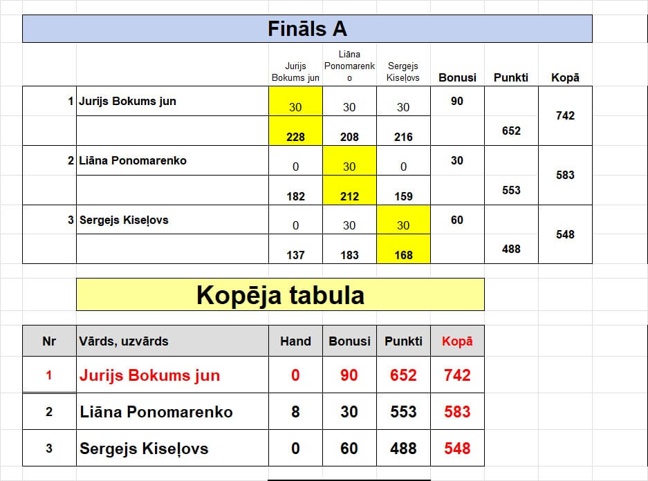 A grupā – Lai arī savstarpējā spēlē Jurijs Bokums juniors apspēlēja Arsēniju Hudjakovu junioru, tomēr kopsummā par uzvarētāju kļuva Arsēnijs Hudjakovs un tādējādi pārtrauca divu posmu uzvaru Jurijam Bokumam. Jurijs kopsummā tika apsteigts par 16 ķegļiem.