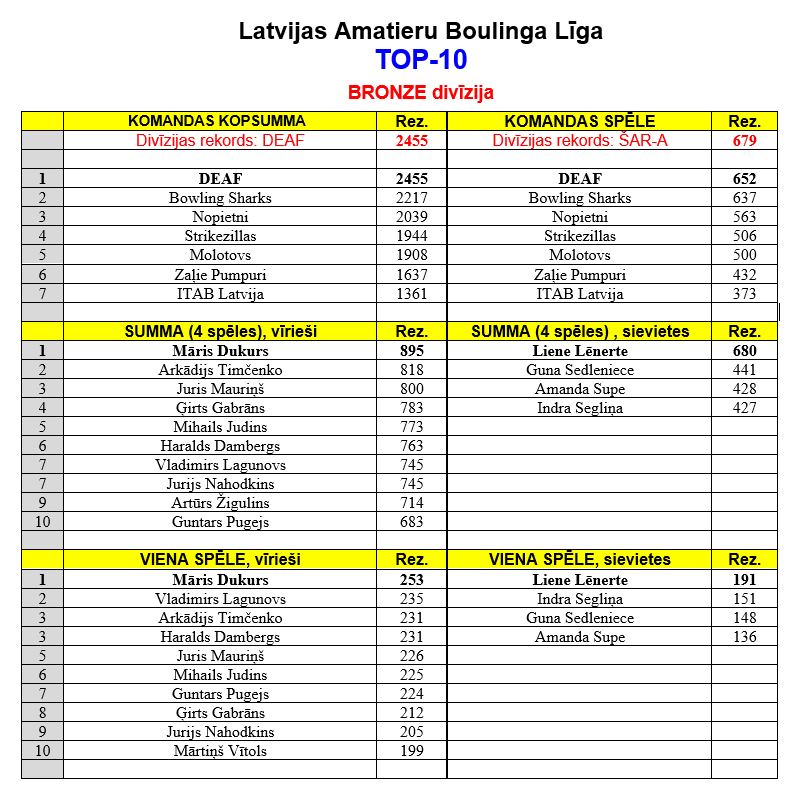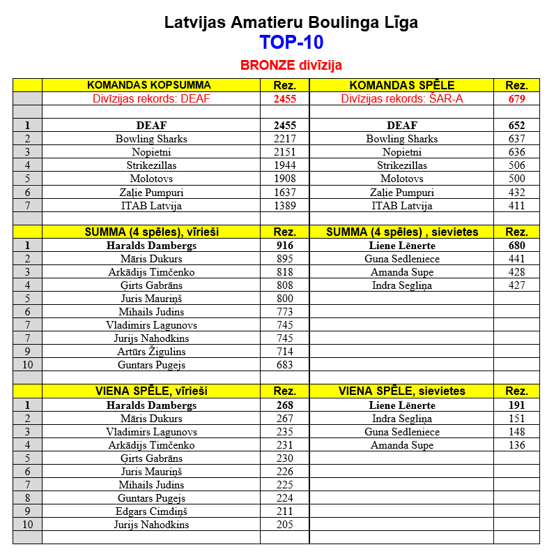 | 10 | DEAF (NB Veterāni, Nedzirdīgo Boulings 2) | 309 | 161 | 3 | 145 | 0.521 | 1549 | 1471 | 78 | 325 |