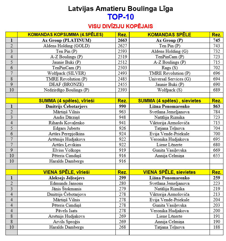 | 24 | NB Rīga (Nedzirdīgo Boulings 3) | 244 | 117 | 0 | 127 | 0.48 | 1204 | 1236 | -32 | 234 |