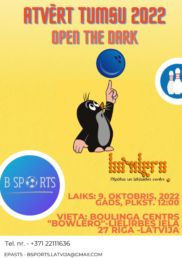 2022.gada 09.oktobrī Bowlero boulinga centrā notiks Boulinga sacensības cilvēkiem ar redzes traucējumiem un viņu atbalstītājiem, t.sk. bērniem, jauniešiem un senioriem.