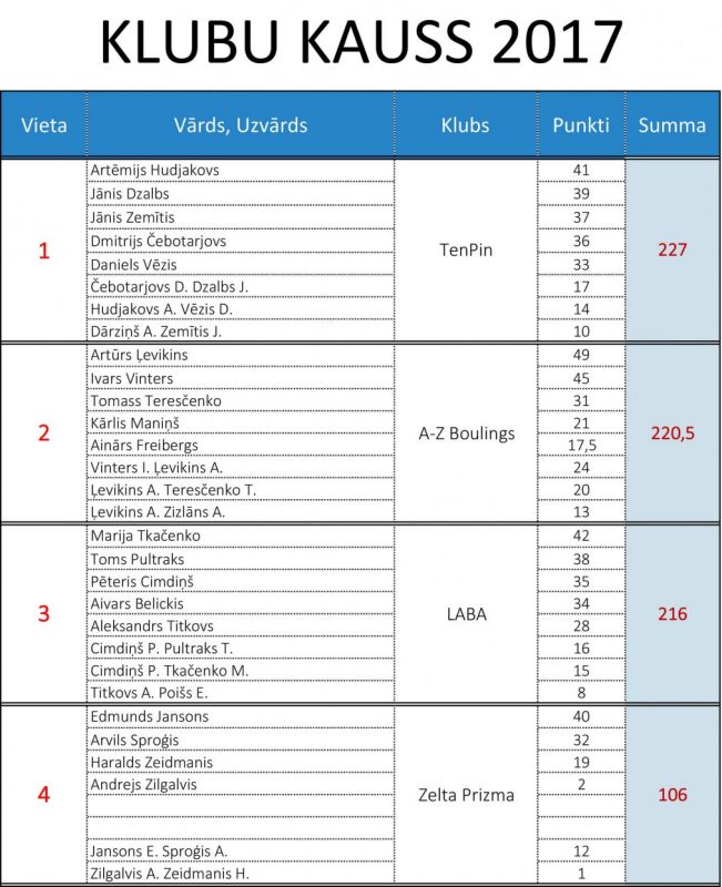 “Pepsi Centrā” notika kārtējā Klubu Kausa izspēle. Šogad cīņa par uzvaru bija ļoti sīva un neprognozējama. Komandas ieņēma tās pašas vietas kā pagājušajā gadā. Galveno trofeju ieguva klubs “Ten Pin“, otrajā vietā finišēja klubs “A-Z Boulings“, trešā vieta – “LABA” un turnīra tabulas lejas daļā ierindojās turnīra organizators – klubs “Zelta Prizma“.