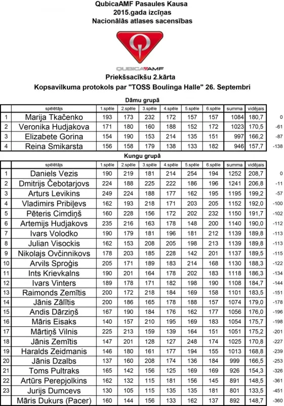 Latvijas nacionālā atlase uz QubicaAMF Pasaules Kausu Sep 26, 2015 | Boulinga turnīrs, Boulings, Boulings Latvijā, Latvijas atlase BOWLING WORLD CUP QubicaAMF-2015 Priekšsacīkšu 2.kārta (26.09.2015) Submit a CommentJūsu e-pasta adrese netiks publicēta. Obligātie lauki ir atzīmēti kā *Komentārs * Vārds * E-pasts * Tīmekļa vietne