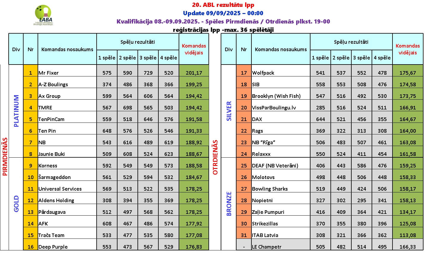 No 08 līdz 09. septembrim Pepsi Boulinga Centrā norisinājās 20. Amatieru Boulinga Līgas kvalifikācijas spēles. 20 sezonas komandu spēlētāji aizvadīja 4 spēles un mēs esam noskaidrojuši visu divīziju komandas. Kā iepriekš arī šajā sezonā startēs 4 divīzijas pa 8 komandām. Izņēmums ir Bronze divīzija, jo tur startēs 7 komandas. No sacensībām noņēmusies komandas LE CHAMPETR. Komandas spēlētāji pievienojušies komandai – Pārdaugava. Sezonas gaitā iespējama jaunu komandu pieteikšana.