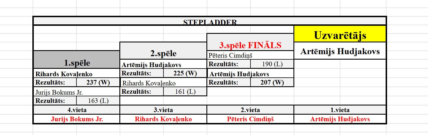 1️⃣ Pirmā spēle: 3.vieta pret 4.vietu. (3) Rihards Kovaļenko un (4) Jurijs Bokums juniors. Rezultāts: 237 vs 163 Riharda labā.
