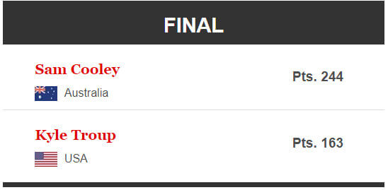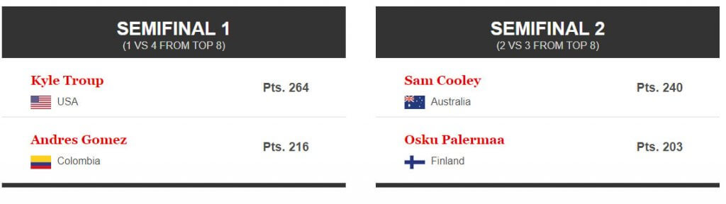 Top three after the first Men’s Block are Kyle Troup, JoJoe Yannaphon and Andres Gomez.