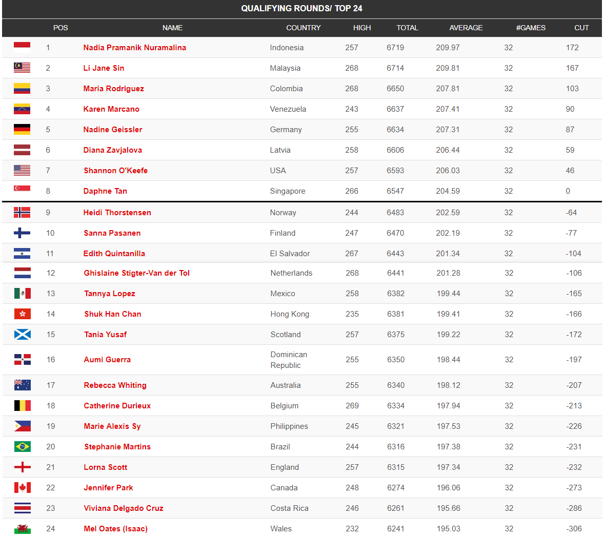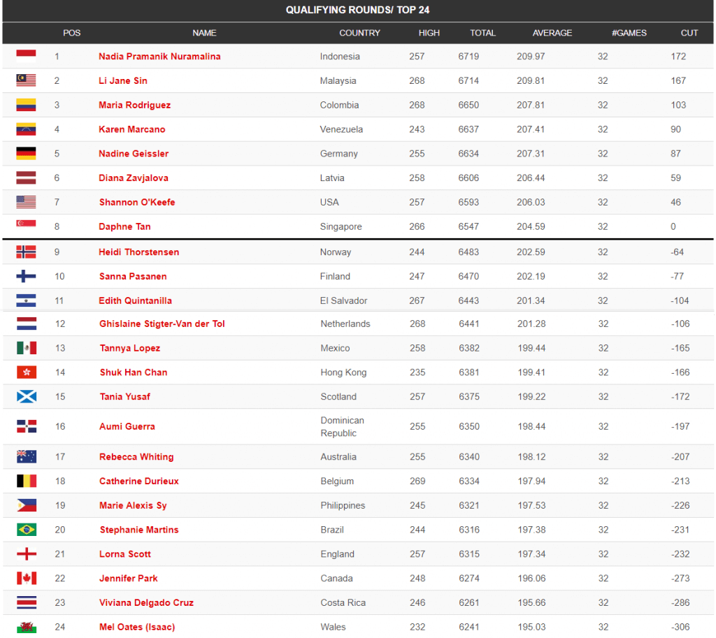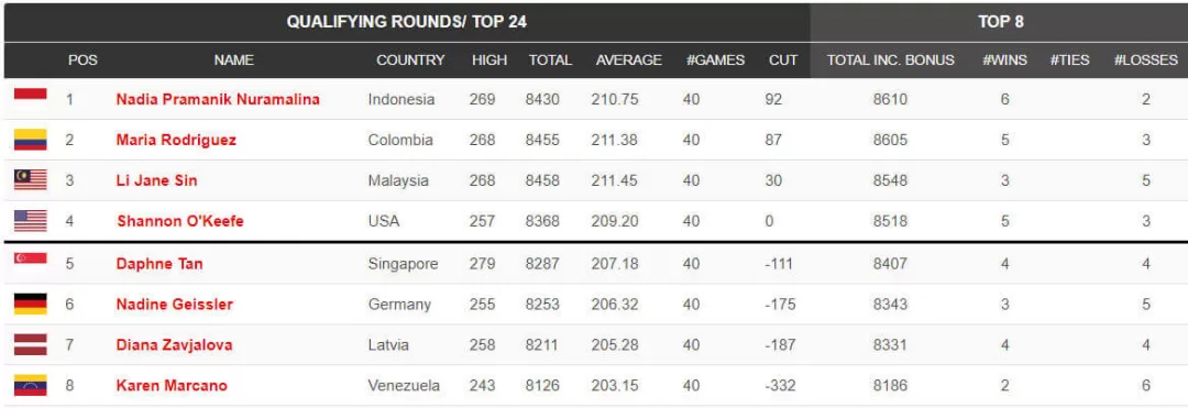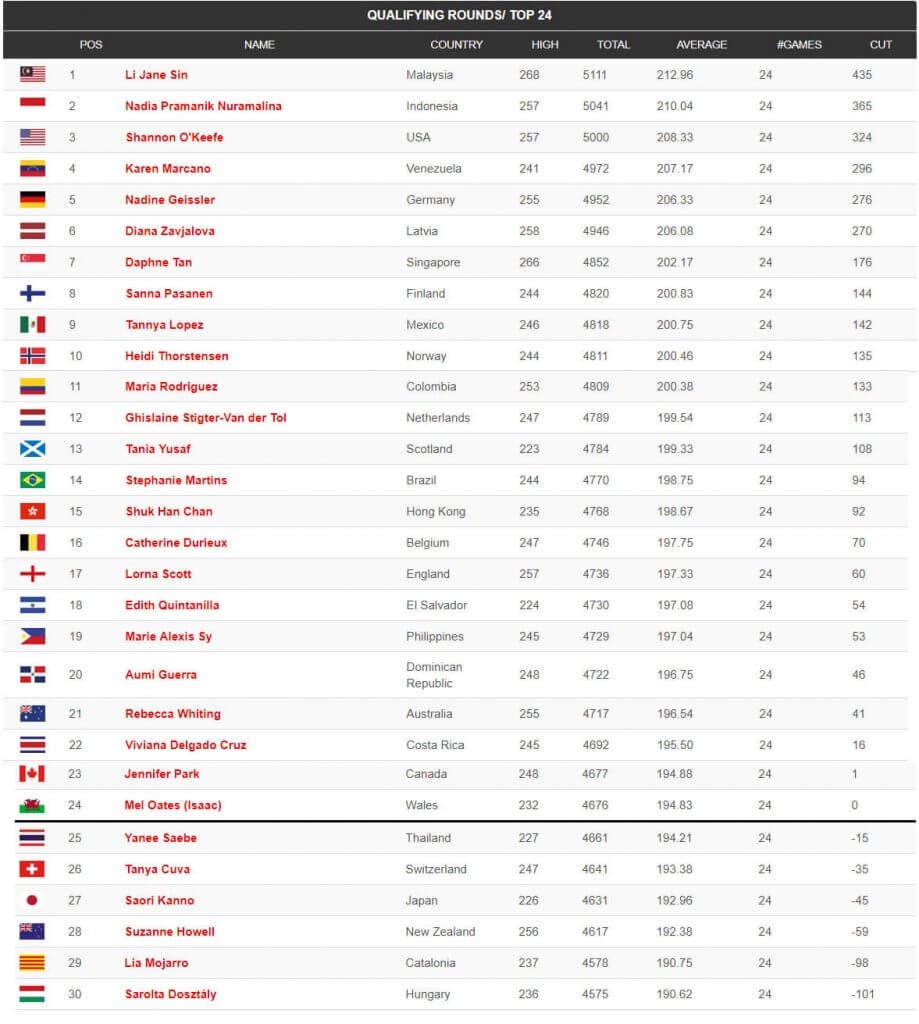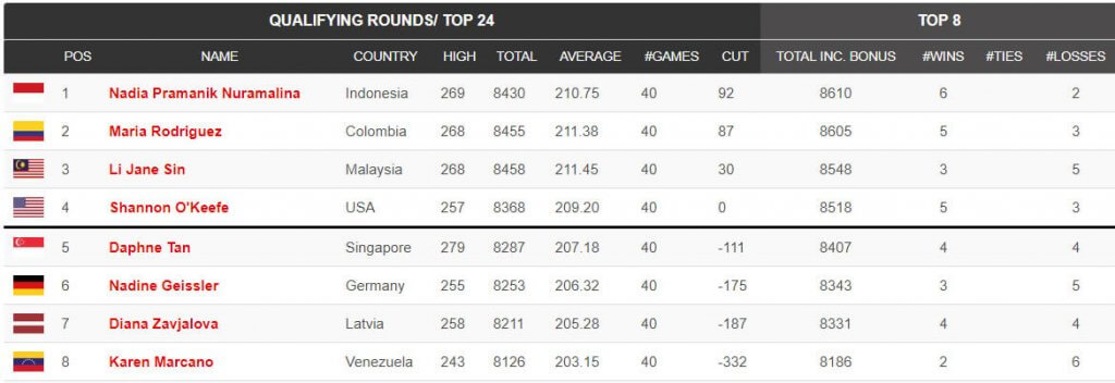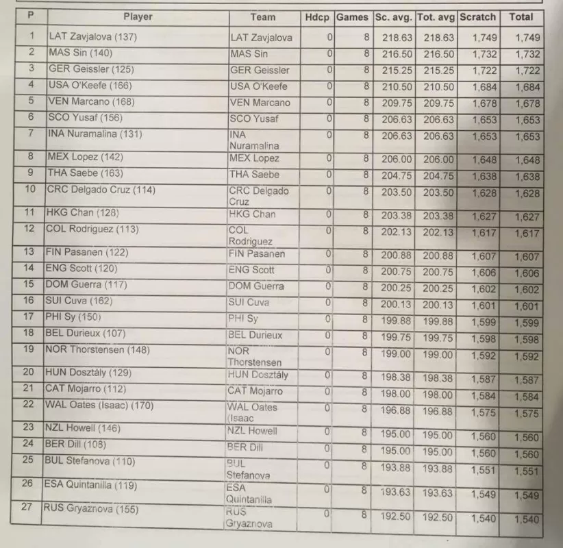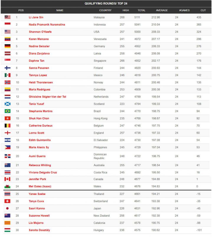 Noslēgušās kvalifikācijas spēles sievietēm. Diāna Zavjalova ierindojās 6 vietā, iekļūstot TOP 24. Turpinājums jau šovakar, kur tiks izspēlētas vēl 8 spēles un tiks noskaidrots Top 8. Ķegļu summa no kvalifikācijas spēlēm plusosies klāt šai astoņu spēļu kegļu summai.