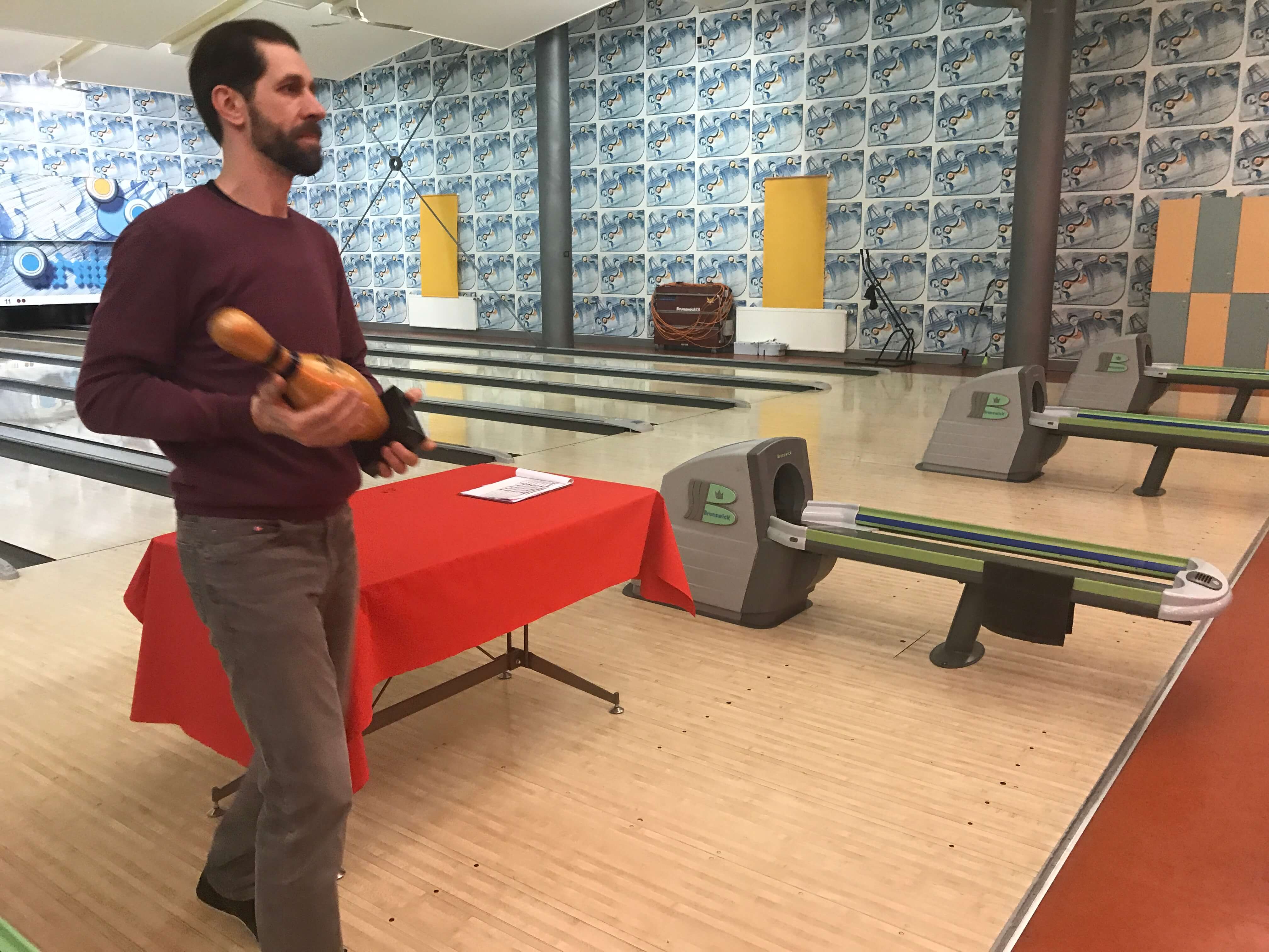 Pink Panther and Big Nose compete in a serious game of bowling.