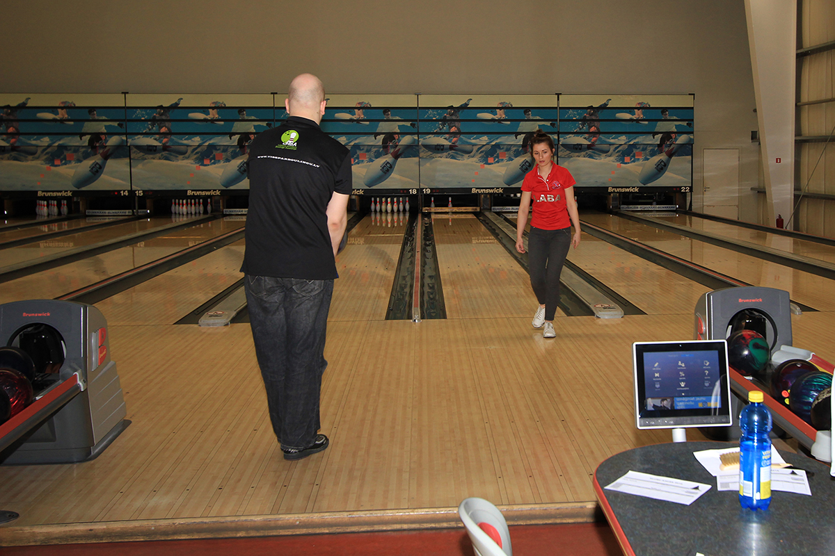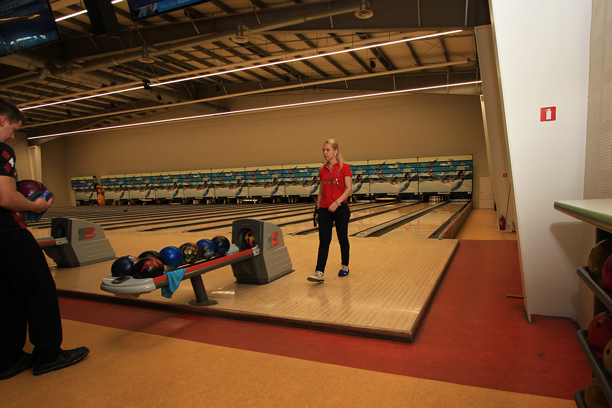 Pink Panther and Big Nose compete in a serious game of bowling.